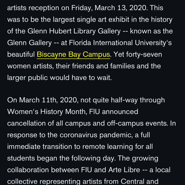 Over 50 female artist's displayed their unique works at the Group Showing with the Arte Libre group at the FIU Biscayne Bay Campus, Glenn Hubert Library. On opening night, Friday the 13th, the Covid shut down began.