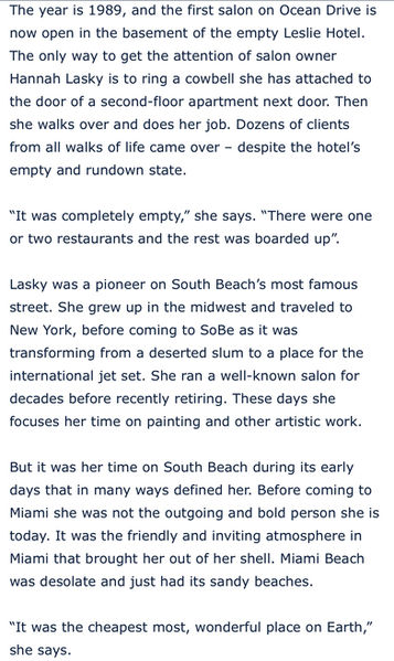 Miami, Florida based artist, Hannah Lasky, always has the art world wondering what she is going to do next. Her unique works were on display in her Hair Art Studio, Hannah & Her Scissors from 1996 - 2020 in all forms - there she gained increasing attention locally, nationally and on the international stage after she moved from NYC to South Beach in 1987. Email her at hannah_lasky@aol.com